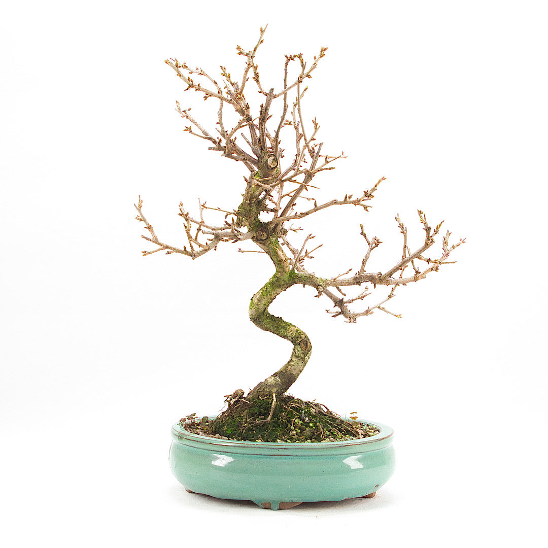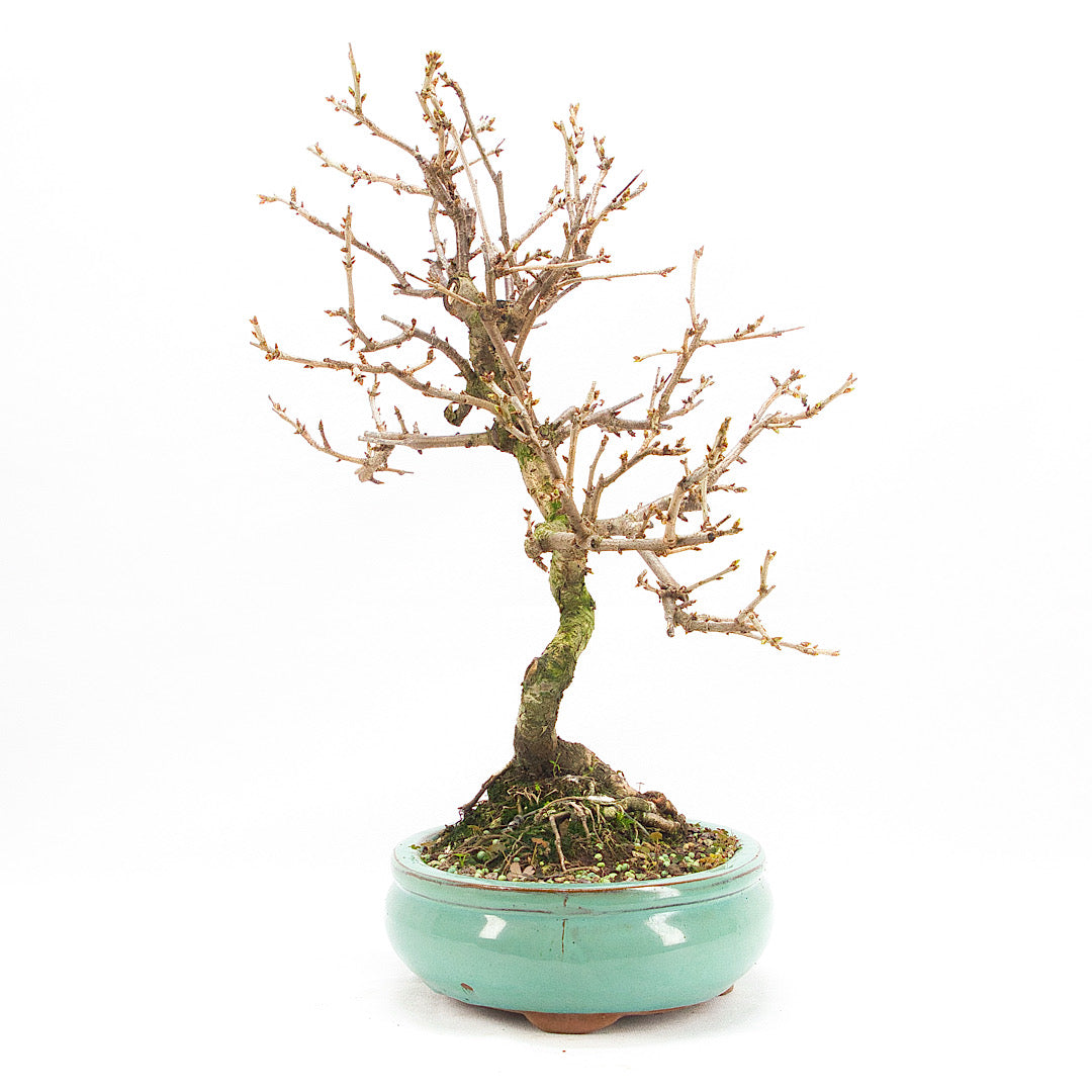 Ein Drahten ist bei der Steinweichsel nicht nötig und sollte auch vermieden werden. Das Abspannen der Äste ist problemlos möglich. Ein Umtopfen ist alle zwei bis drei Jahre ratsam – idealerweise im Frühjahr vor der Blüte. Dabei eignet sich ein Substrat aus Akadama-Erde und Mineralsubstrat im Verhältnis 2:1.